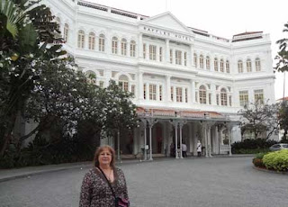 Även om jag var trött ville jag inte missa något. Här står jag utanför Raffles Hotell i Singapore, ett MÅSTE när man besöker Singapore, enligt alla tips jag fått på Facebook och min blogg inför min resa till Singapore.